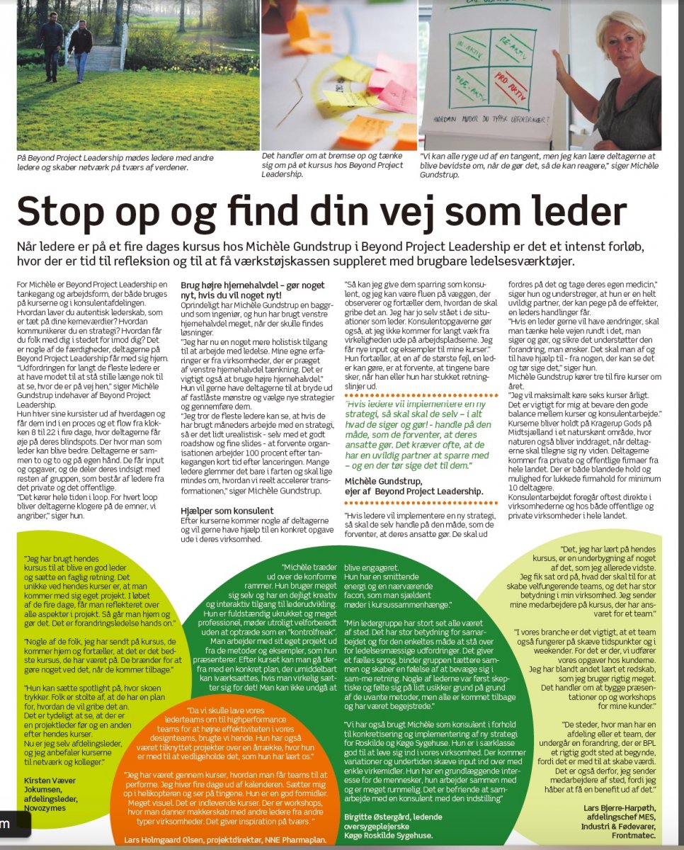Hen over efterårsferien havde jeg – og 4 ledere i mit netværk, der også har BPL mindsettet som en del af deres ledelses DNA - den fornøjelse at blive interviewet til en artikel i Jyllandsposten. Og jeg siger bevidst ’fornøjelsen’. Dels fordi det var en god journalist der kontaktede os, men selvfølgelig også fordi det jo absolut er en fornøjelse at se der er interesse for den måde at arbejde på, som jeg har brugt i så mange opgaver. Den tankegang og form for ledelse som både kommer til udtryk på vores 4 dages BPL kurser, men også i de store som små consulting opgaver jeg løbende har.